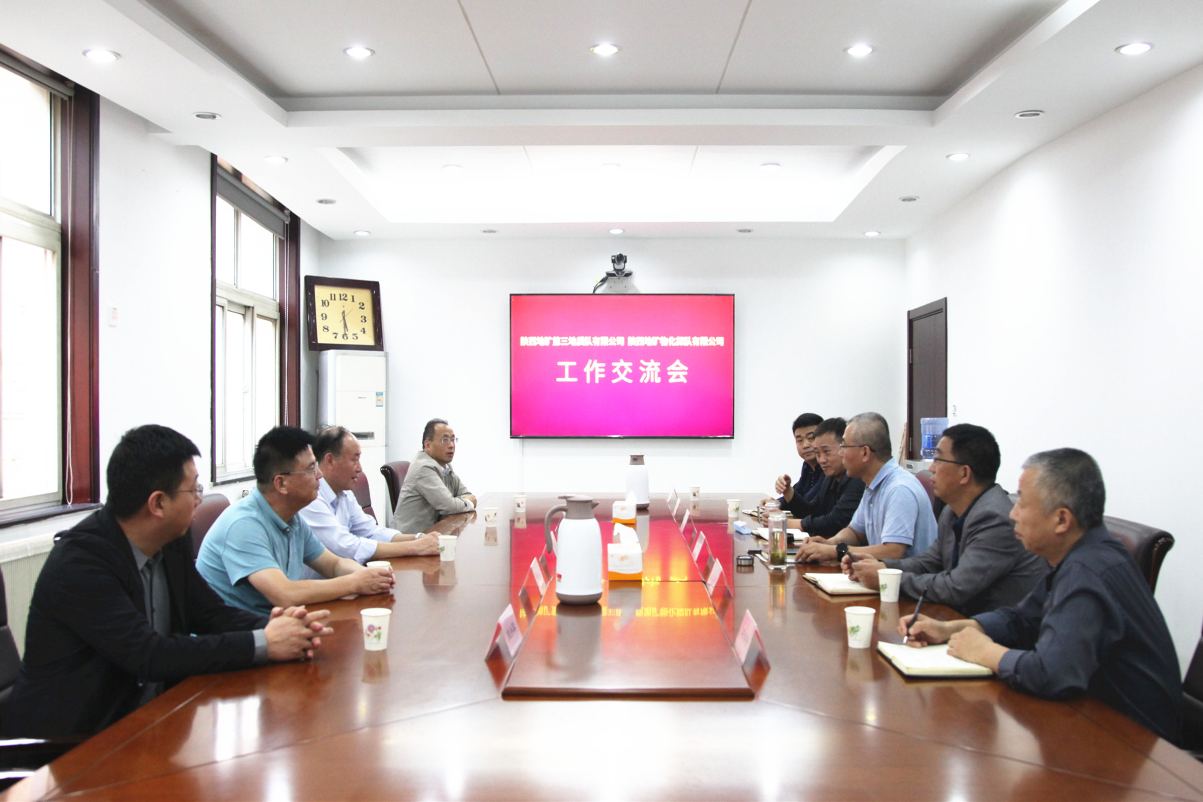 ? ? 9月25日下午,陜西地礦第三地質(zhì)隊(duì)有限公司黨委書記、執(zhí)行董事、總經(jīng)理李煥林,副總經(jīng)理賀永平、李亞成,紀(jì)委書記李軍政,總會(huì)計(jì)師、辦公室主任史小軍一行,來(lái)物化探隊(duì)有限公司調(diào)研交流工作。公司領(lǐng)導(dǎo)班子成員及相關(guān)部門負(fù)責(zé)人與李煥林一行進(jìn)行了親切座談。