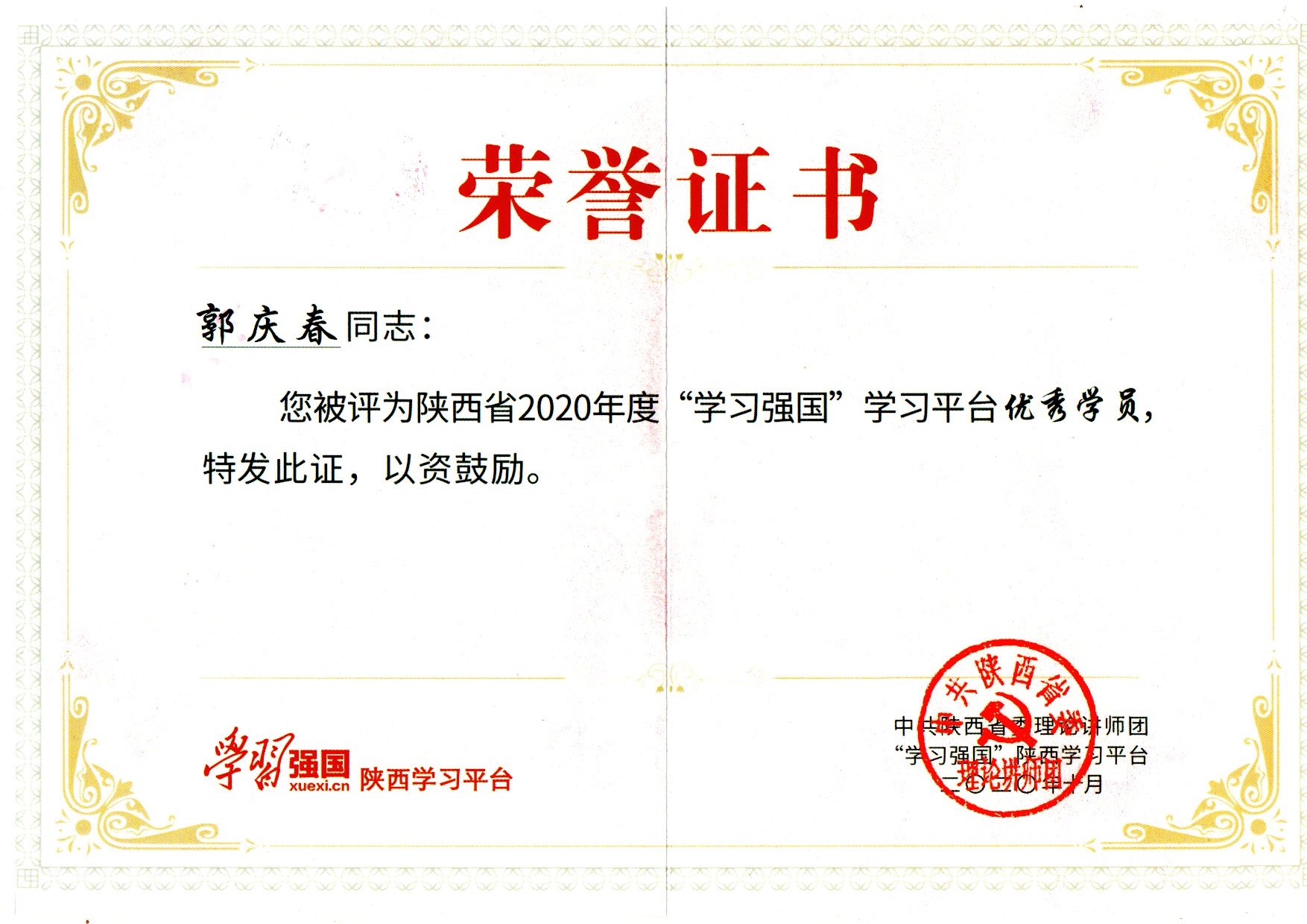 ? ? 近日,我公司周至管理處黨支部黨員郭慶春同志,榮獲陜西省2020年度“學習強國”學習平臺優(yōu)秀學員稱號。